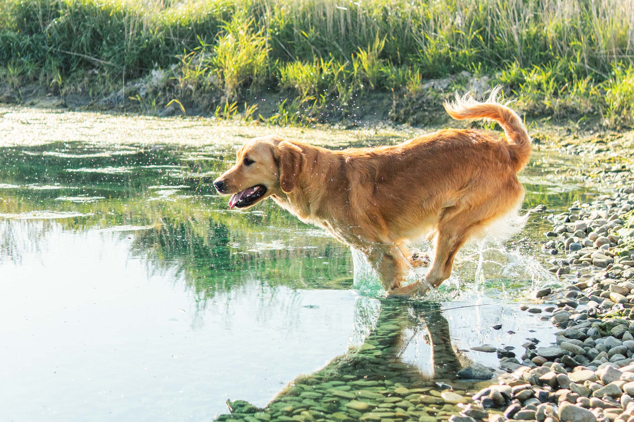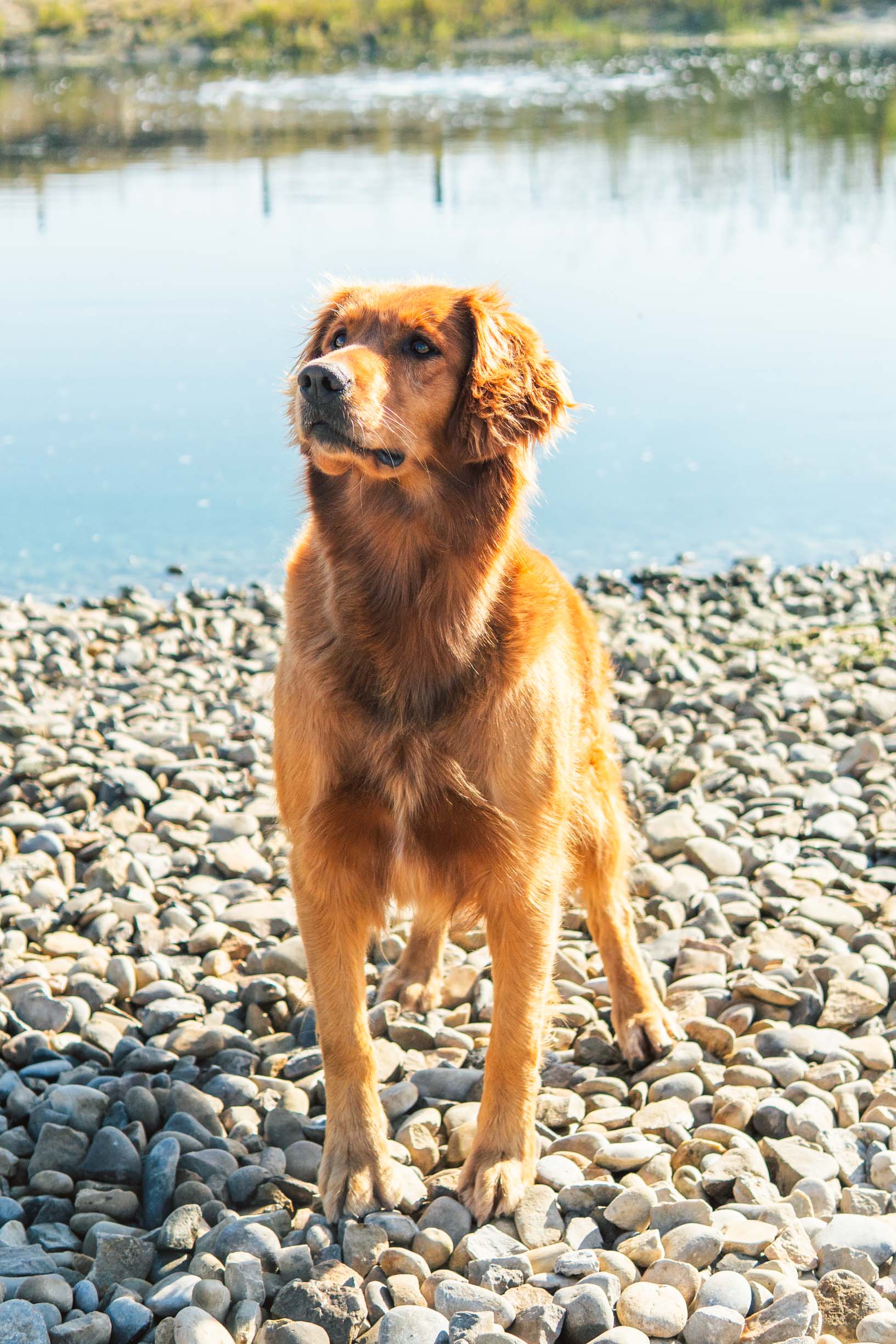 Journey, as we call her, has the perfect golden retriever temperament. She is darkest of my dogs and has such beautiful intelligent, almost questioning eyes. You just cannot resist her! Her outstanding point is her temperament. She is so gentle and the calmest retriever I have seen, and yet has plenty of stamina and energy for the field. I plan to use her for therapy purposes because she is so patient and connected. On the other hand she would make an excellent hunting dog due to her keenness and drive. She is just a very special dog… She shares the same outstanding pedigree as her brother Phoenix as you will see if you look her up on K9data. She did great on her health clearances and genetic testing.